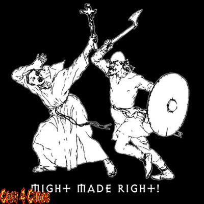 Might Made Right with white ink on black canvas back patch 7" x 8"